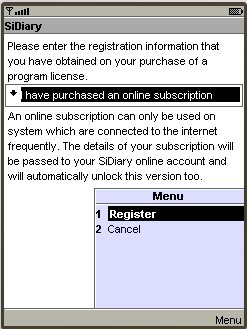 Should you have purchased the subscription version of SiDiary, you will be able to register all program versions (PC, Pocket PC, Windows Smartphone, Android and Java-based cell phone) to use SiDiary for 12 months without adware restrictions and commercial pop-ups.